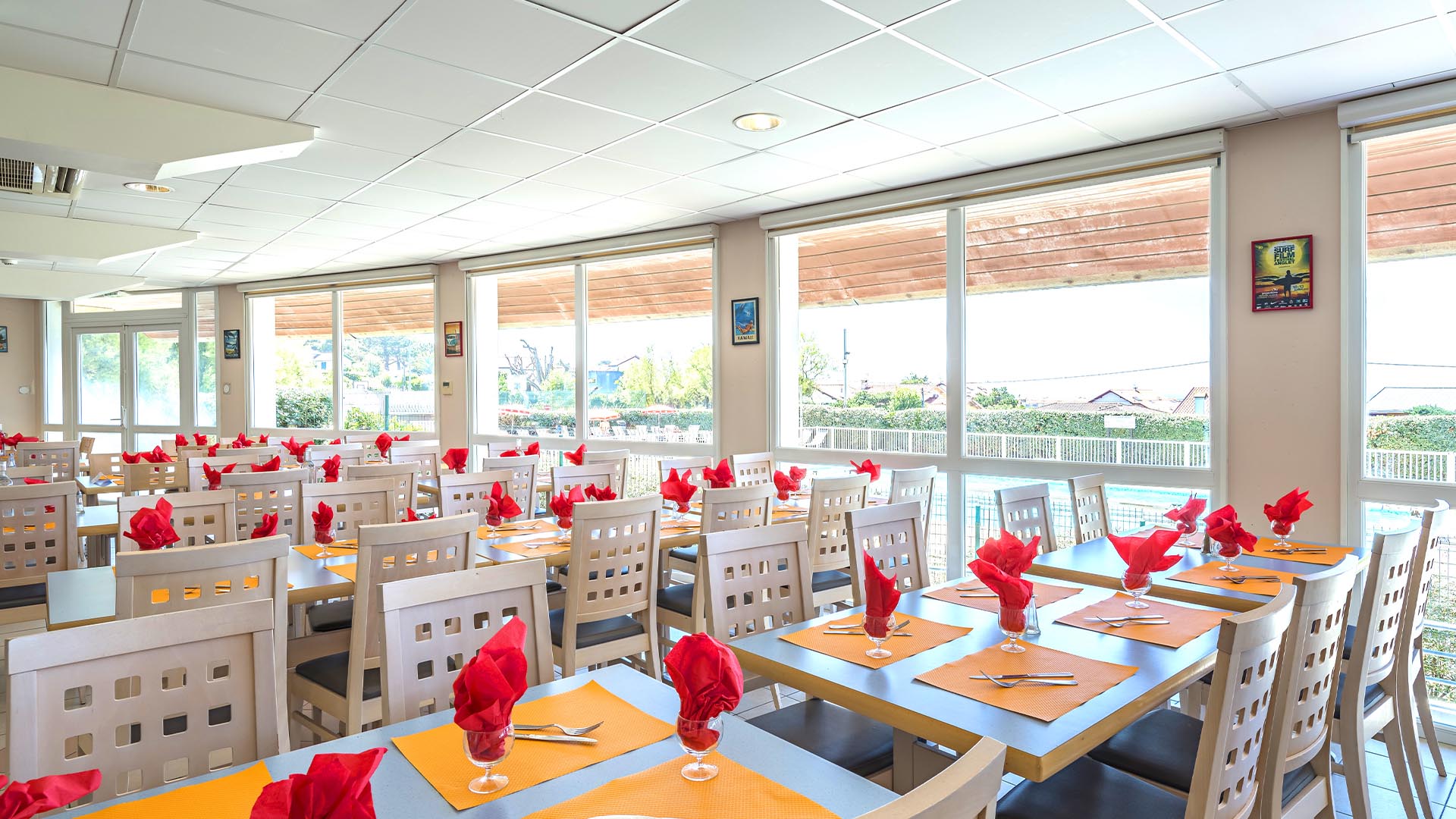 • Salle de restauration climatisée, terrasse avec vue sur la piscine.