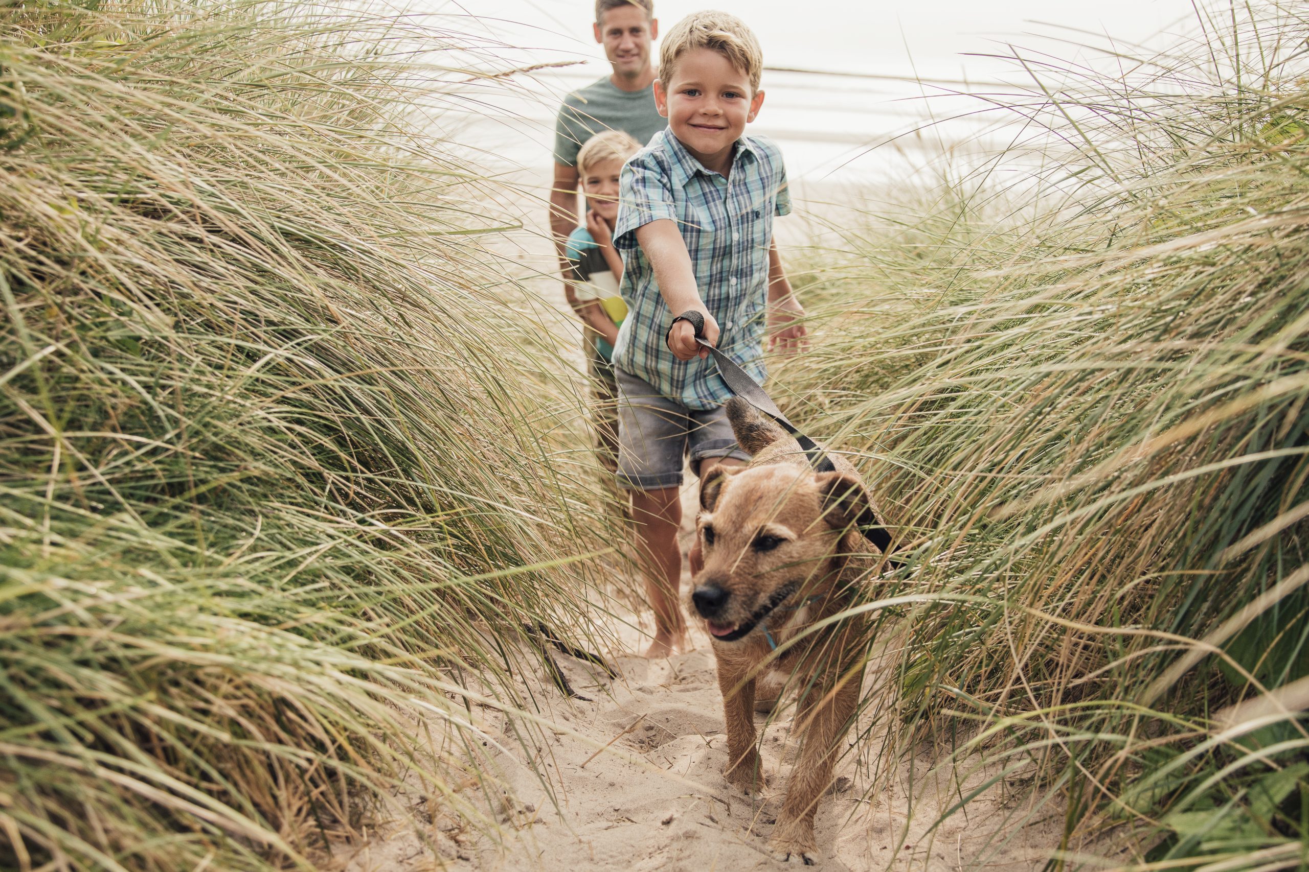 Famille avec chien en premier plan